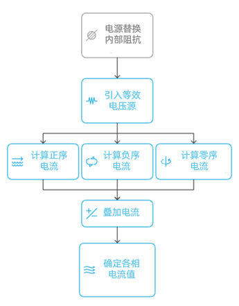 依据IEC 60909-0标准,需采用“对称分量法”,基于电网各元件的阻抗参数进行计算。具体步骤为:替换电源为内部阻抗→引入等效电压源→计算正序/负序/零序电流→叠加得到各相电流。